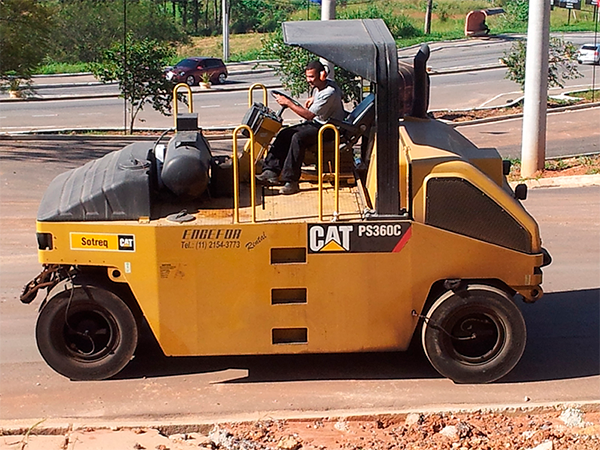 Equipamento específico para compactação de camadas asfálticas, eventualmente utilizado para compactação de material distinto, porém fino, o rolo compactador pneumático utiliza a variação de peso e pressão dos pneus, para aumentar a eficiência e esforço de compactação. A linha de Rolo Compactador Caterpillar PS 360 chega a pesar no máximo 25 toneladas. A relação carga/número de pneus possibilita maior tensão aplicada ao material no processo de rolagem, aumentando a eficiência de compactação.